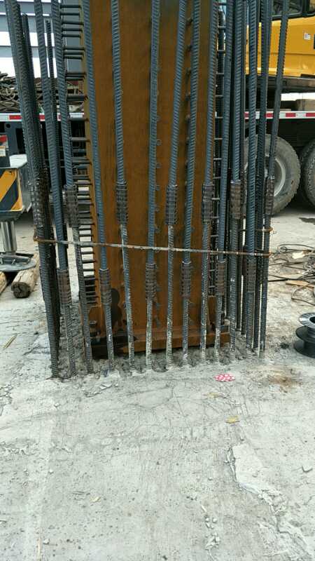 2、為提高工效,在加工場區(qū),將鋼套筒與鋼筋連接,完成擠壓頭的一半,在現(xiàn)場擠壓另一半,但半成品要架起放置,防止擠壓筒內(nèi)被污染。